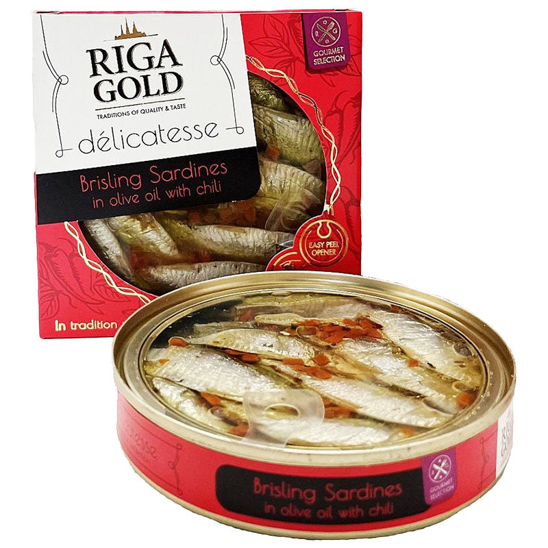 RIGA GOLD -Clear Top- Brisling Sardines in Olive Oil /w Chili (Gourmet) 120g